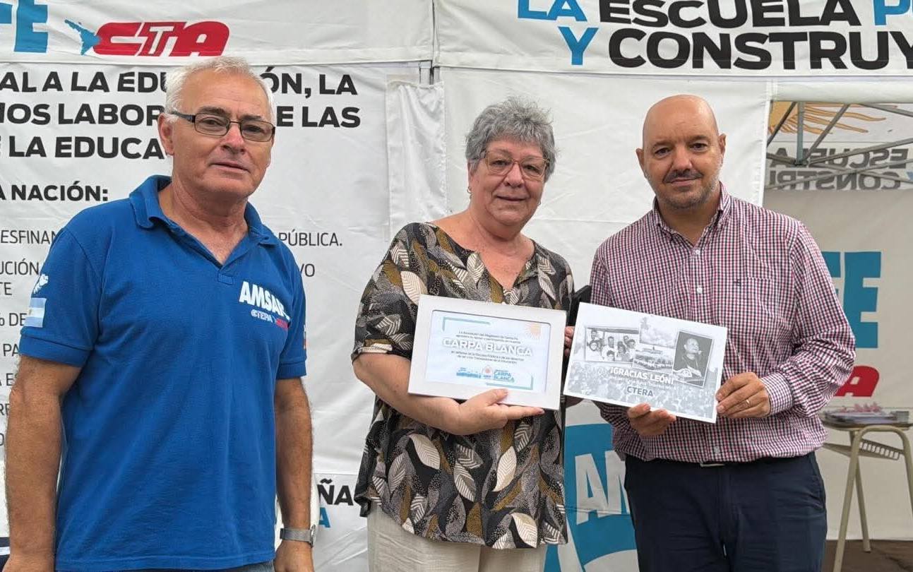 Un momento muy emotivo fue la entrega a Malvina Gieco de una fotografía testimonial que muestra a su hermano, León Gieco, en la Carpa Blanca del ’97 en apoyo a los docentes. El gesto enlazó la lucha actual con aquel hito de resistencia del sector.